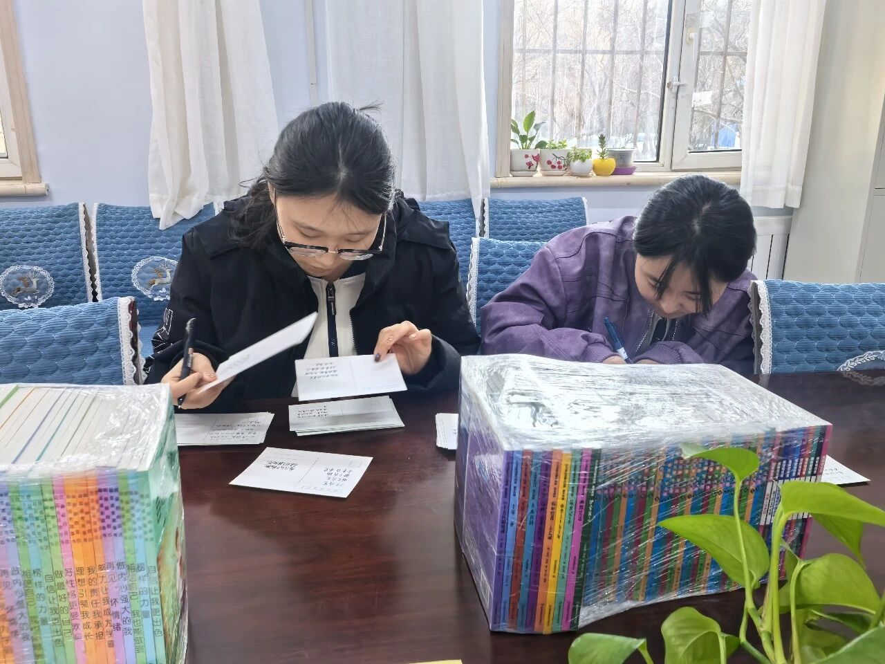活动的尾声,一个如春日暖阳般温情的场景悄然发生。众人离去后,两位同学主动留下,默默为即将捐赠给山区儿童的书籍填写爱心卡。